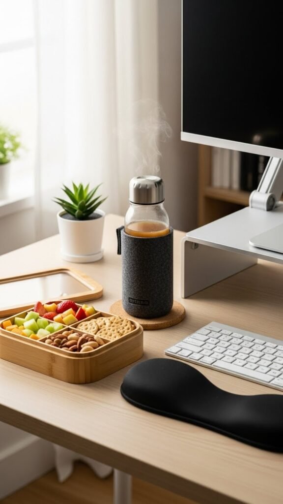 Place a portable snackbox for quick energy, an insulated bottleholder to maintain warmth, and a coaster for spills. Keep items minimal, easy to reach, and regularly restocked so you stay fueled and free to work without interruptions.