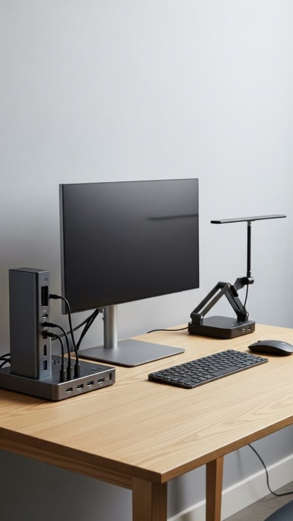 Make the most of limited desk real estate by choosing compact, multi-function devices that collapse clutter and add capability. You’ll prefer a modular docking hub that charges gadgets, routes cables, and mounts peripherals. Pair it with a convertible lamp that folds away and provides adjustable light and USB ports. Choose durable, minimalist pieces so you stay mobile, focused, and free of excess gear.