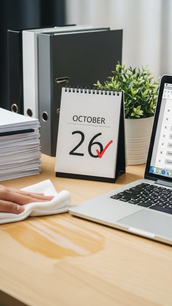 You’ll clear papers, stash current projects in designated spots, wipe surfaces, and close tabs for a quick mental declutter.