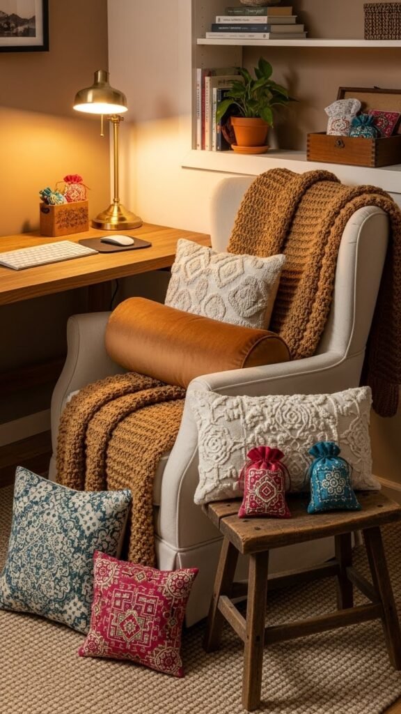 Carve out a small corner of your workspace and outfit it with a chair or stool that supports short restorative breaks; add a soft throw, a lumbar pillow, and a low-wattage lamp to create immediate warmth and comfort.