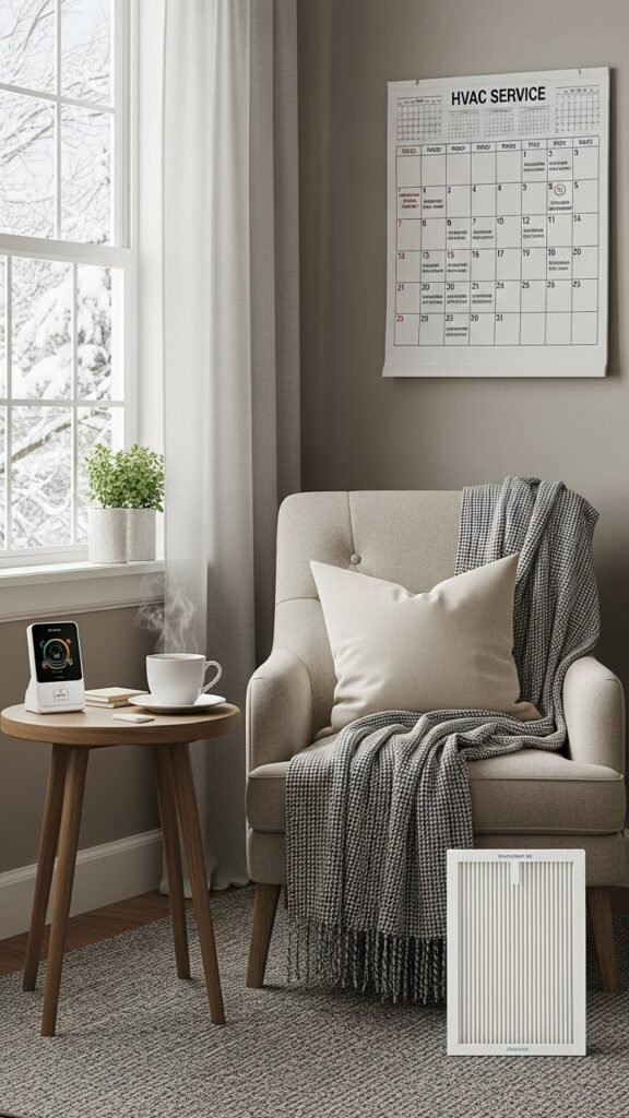 While a cozy corner helps you reset, air quality and heating influence how long you can stay comfortable and productive. Schedule seasonal HVAC service, prioritize filter replacement, and book a duct inspection to prevent cold spots and dust. You’ll breathe cleaner air, reduce interruptions, and maintain steady warmth. Routine checks free you to focus, work longer, and enjoy winter without worry.
