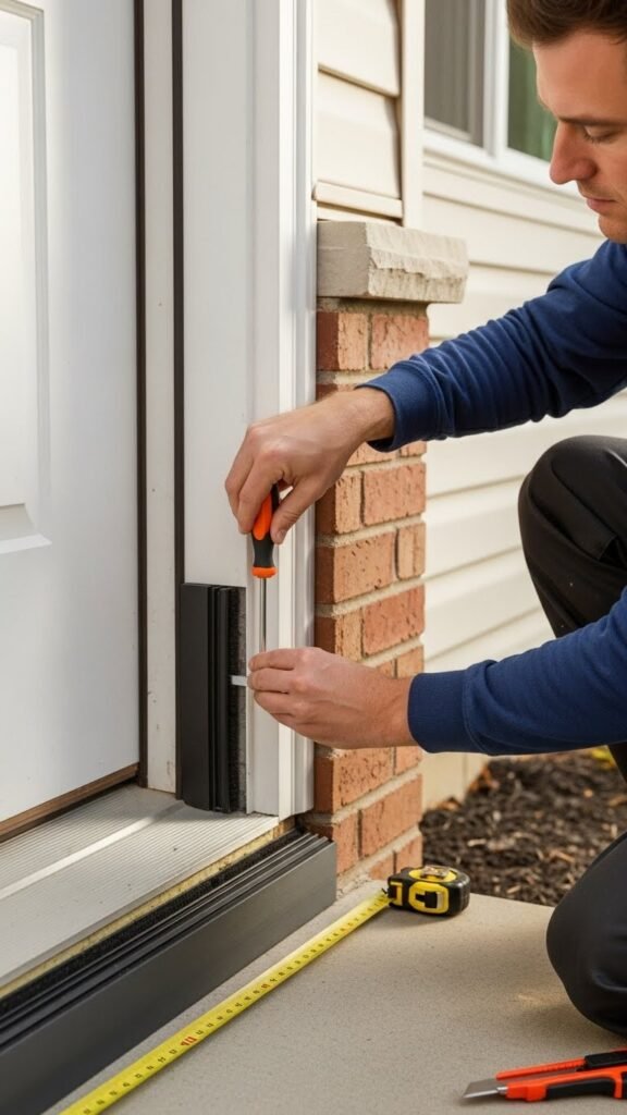 After you’ve sealed visible gaps around frames and sashes, focus on the space under exterior doors—small openings there can account for significant heat loss. Install adjustable door sweeps to cut drafts, quantify savings, and improve threshold insulation.