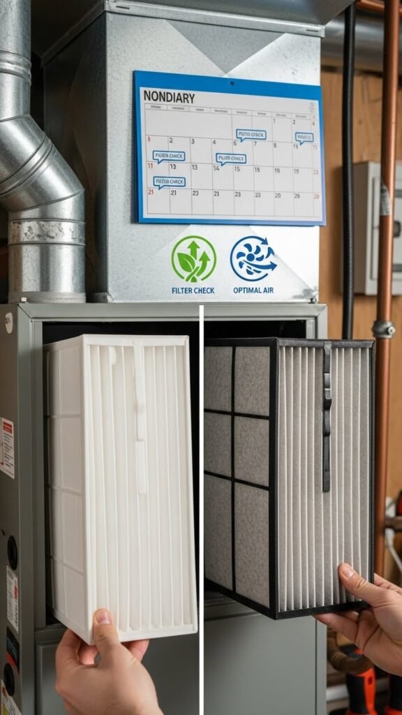 Regularly change or clean your furnace and HVAC filters to keep systems running efficiently and cut energy use—clogged filters can increase blower energy consumption by up to 15% and reduce airflow, forcing your furnace or heat pump to work harder.