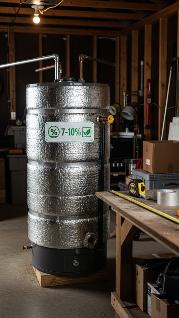 Wrap your water heater with an insulating blanket to cut standby heat loss and lower your energy bill—especially if the tank sits in an unheated garage, attic, or crawlspace.