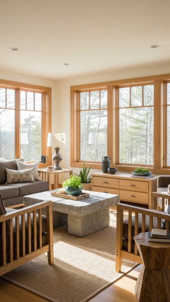 Use sun facing layouts: place seating and thermal-mass surfaces where sun hits. Prioritize furniture thermalization—solid wood or stone near windows stores heat, freeing you from thermostat dependence and lowering bills.