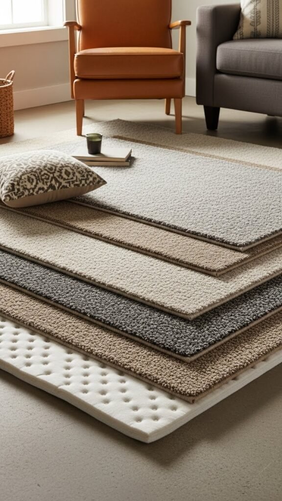 Lay down thick rugs or layered carpets to cut heat loss through hard floors—up to 10–15% of a room’s heat can escape through uninsulated floors, especially over unheated basements or slab foundations. For efficient rugs placement, cover high-traffic and perimeter zones, add rug padding to increase R-value, and prioritize low-cost wool or synthetic options to conserve energy and maintain mobility in your space.