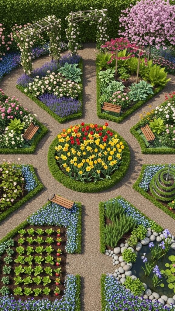 When you sketch your spring garden layout, think in layers—paths, beds, structural plants, and seasonal patches—so every element has space and purpose.