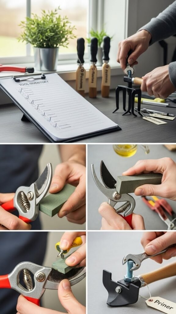 Start by laying out every tool you own—gloves, pruners, shovels, trowels, rakes, hoses, and power equipment—so you can spot wear and missing pieces at a glance.