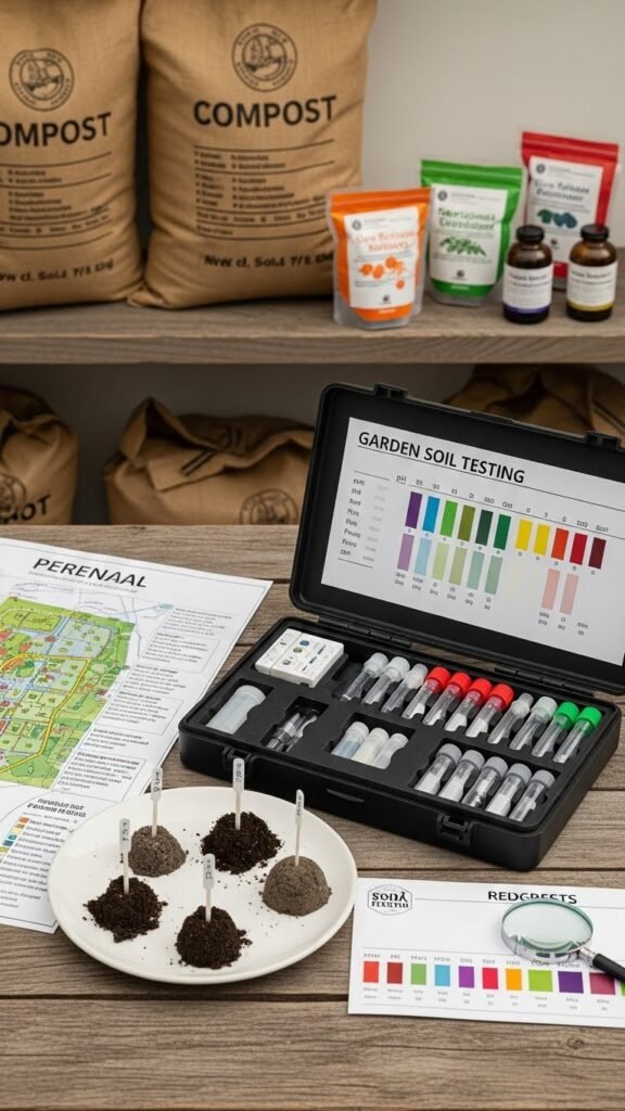 Start by testing your soil to identify exactly what it needs—pH, texture, nutrient levels, and organic matter all drive which amendments will help your perennial beds thrive. Use results to plan targeted additions: compost, slow‑release organics, microbial inoculants to boost biology, and carbonate amendments to correct acidity.