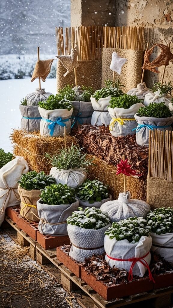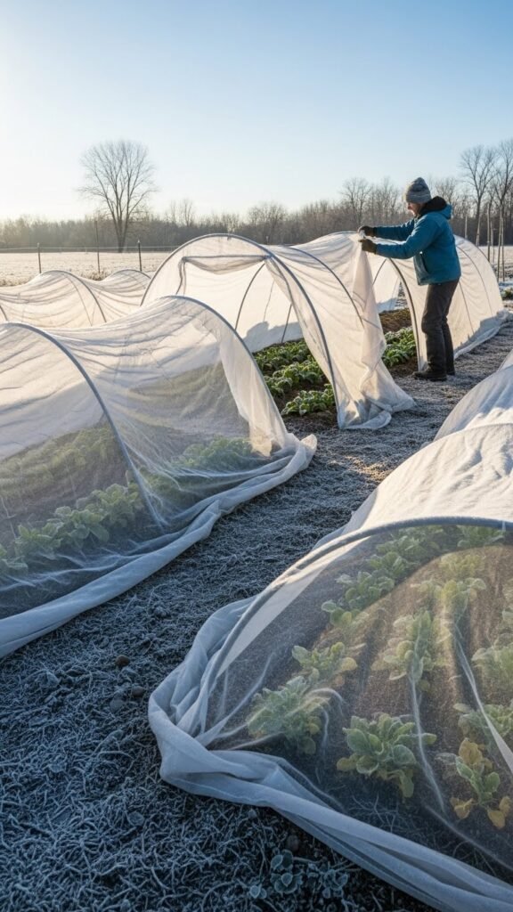 After you’ve firmed roots and applied mulch for winter establishment, protect those young plants from freezing nights and wind by layering coverings and using low tunnels—this extends the growing window and reduces frost damage.