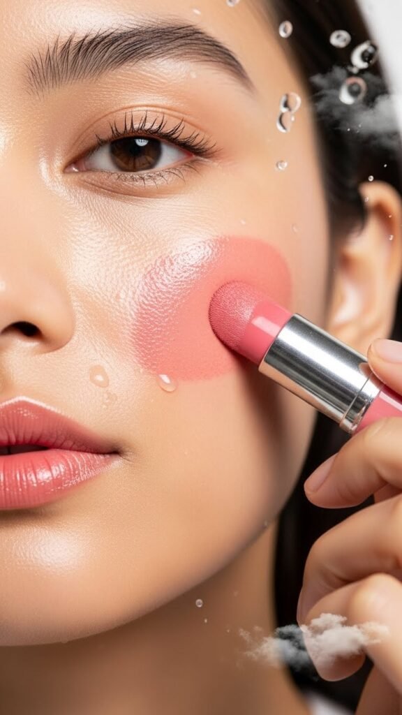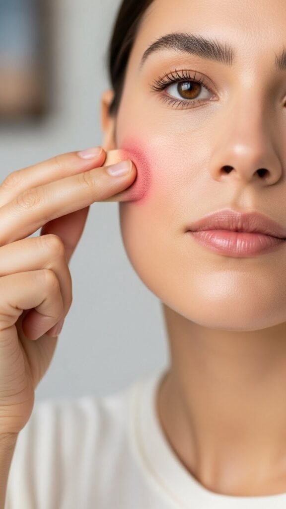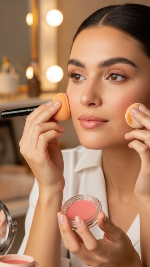 For a seamless, skin-like finish, tap cream blush in with your fingertips or a damp sponge—your fingers warm the product for effortless blending, while a slightly moistened sponge diffuses edges for an airbrushed look.