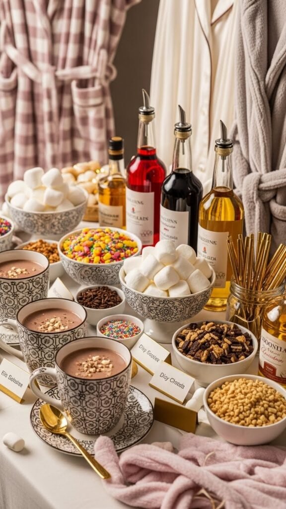 After everyone’s settled into plush pajamas and robes, set up a hot chocolate bar that keeps the cozy mood flowing and adds a little fun to the night.