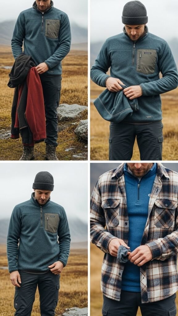 Layer up with a cozy fleece mid-layer or a flannel shirt to trap warmth between your thermal base and outer shell—these pieces give you quick, adjustable insulation when temperatures fluctuate.