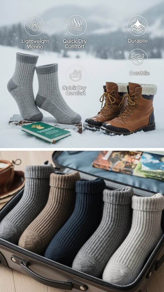 Usually you’ll reach for wool and Merino socks first when packing for a winter trip, because they keep your feet warm, dry, and blister-free without overheating.