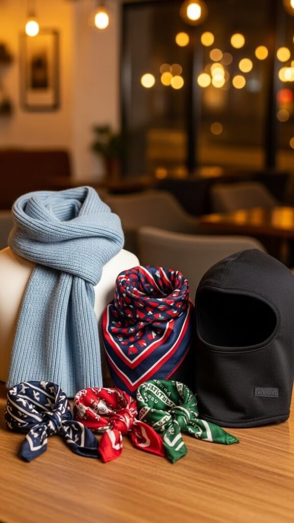 You’ll grab a light scarf for café strolls, silk neckerchiefs for warmth without bulk, and a compact balaclava options piece for windier days. Mix fabrics to stay free and mobile.