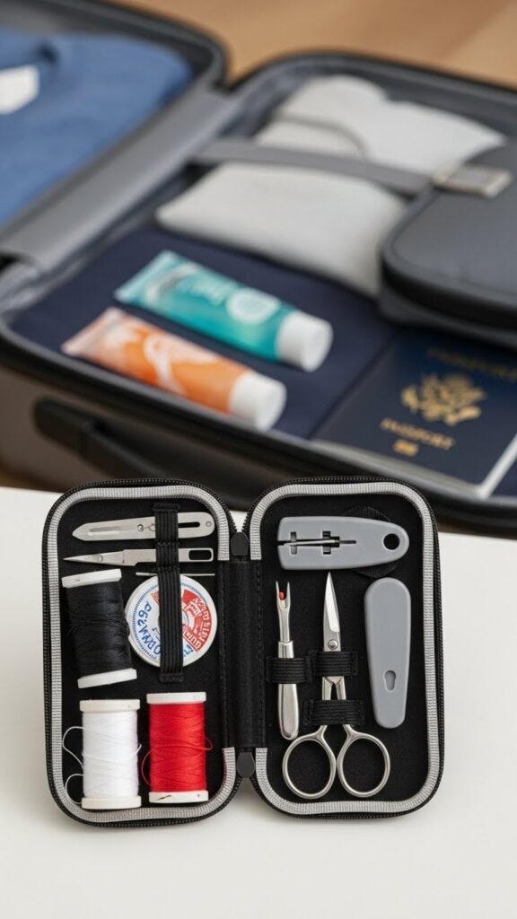 Tuck a slim travel sewing kit into an easy-to-reach pocket so you can fix a popped seam or lost button in minutes without unpacking your whole bag.