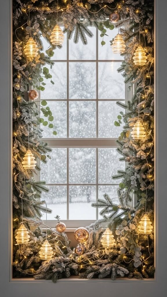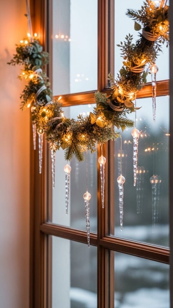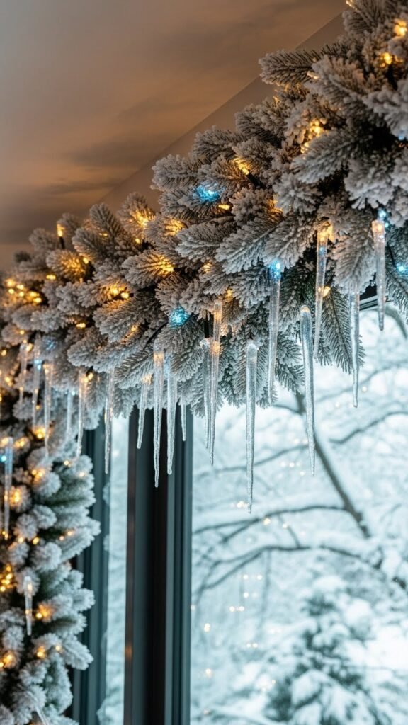 When you drape a frosted evergreen garland across your window, it instantly softens the room with a snow-kissed shimmer and a hint of forest scent; add delicate icicle accents and the effect becomes cinematic.