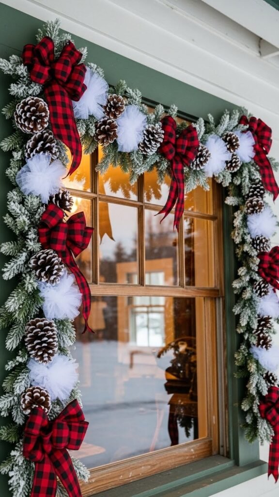 Bring a warm, cottage-style charm to your windows with a Rustic Pinecone and Buffalo Snow Garland that feels both lived-in and on-trend. You’ll string frosted pinecones, sprigs of faux evergreen, and airy snow-dusted tulle, tying in buffalo check bows for contrast.