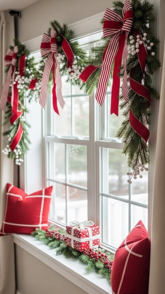 You’ll drape crimson ribbon, white berries, and striped fabric bows along the sill, nodding to holiday traditions while keeping things modern.