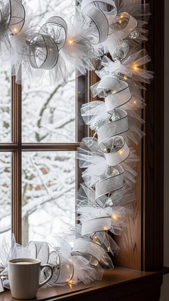 Softly drape layers of tulle and wired ribbon across your window to create a plush, wintry garland that feels both modern and romantic.
