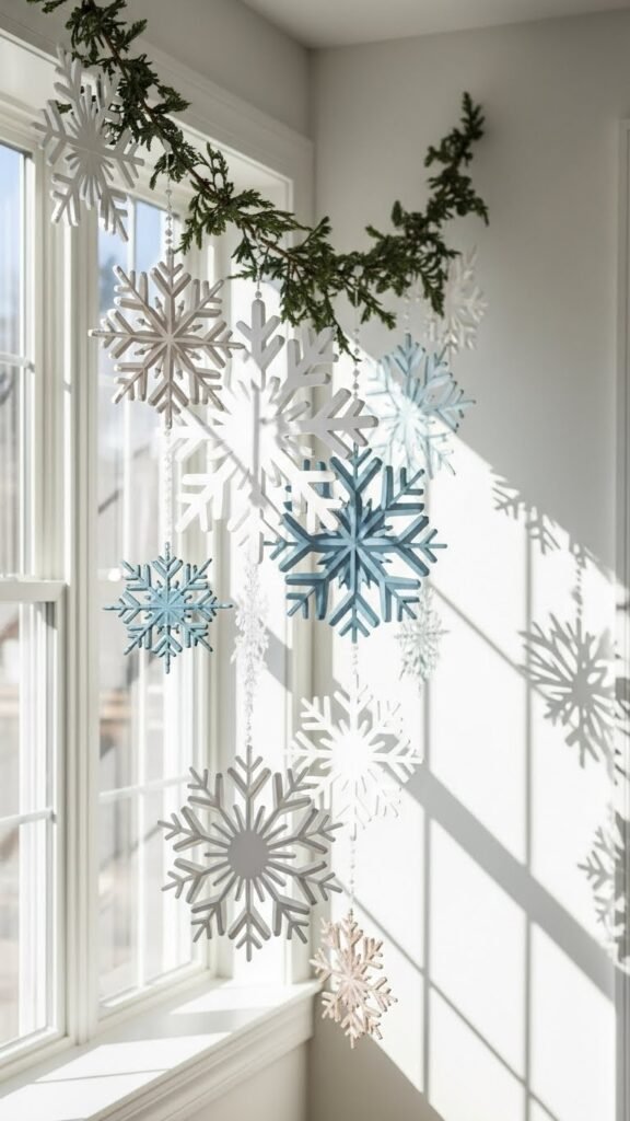 Create a striking winter window centerpiece with an oversized snowflake focal garland that instantly elevates your space. You’ll hang bold, layered snowflakes along a minimal greenery strand, mixing matte whites, icy blues, and soft metallics for contrast.