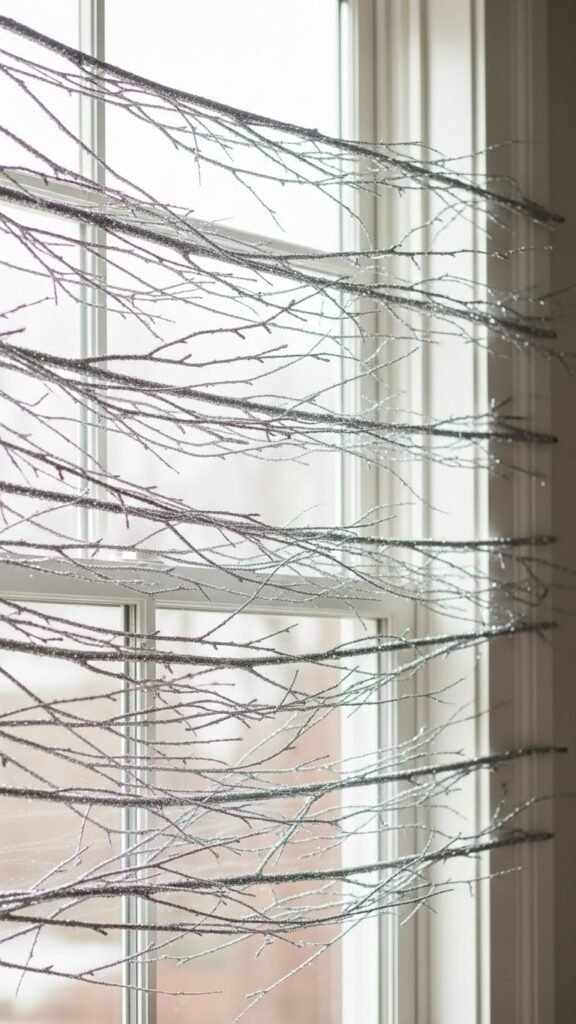 Layer a sparkling branch garland across your window to add winter light with subtle drama; glittered twigs in varying lengths catch the sun and indoor glow, creating depth and shimmer without feeling fussy.
