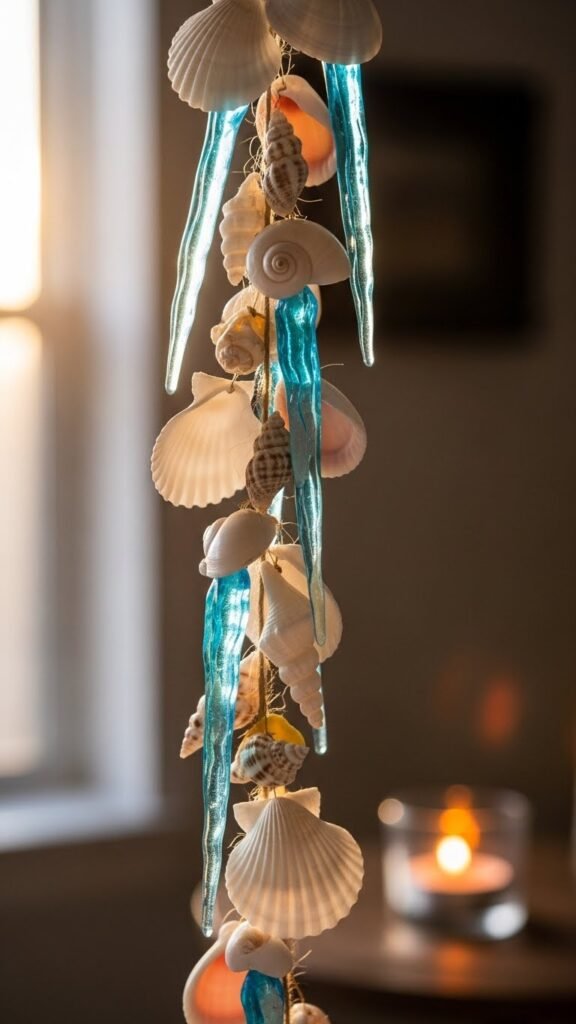A strand of translucent blue icicles and tiny shells will give your window a seaside hush, catching winter light like frozen tide pools. You’ll drape coastal shells on twine, mixing matte sand tones with glassy icicle shimmer.