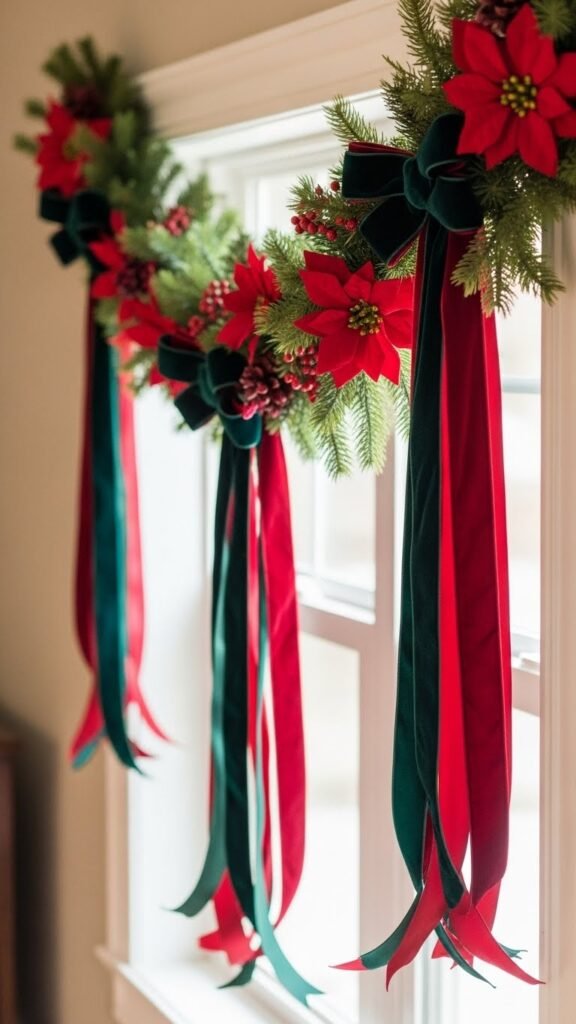 Tie plush velvet ribbons and jewel-toned poinsettias into your window garland to add instant warmth and a touch of vintage glamour.