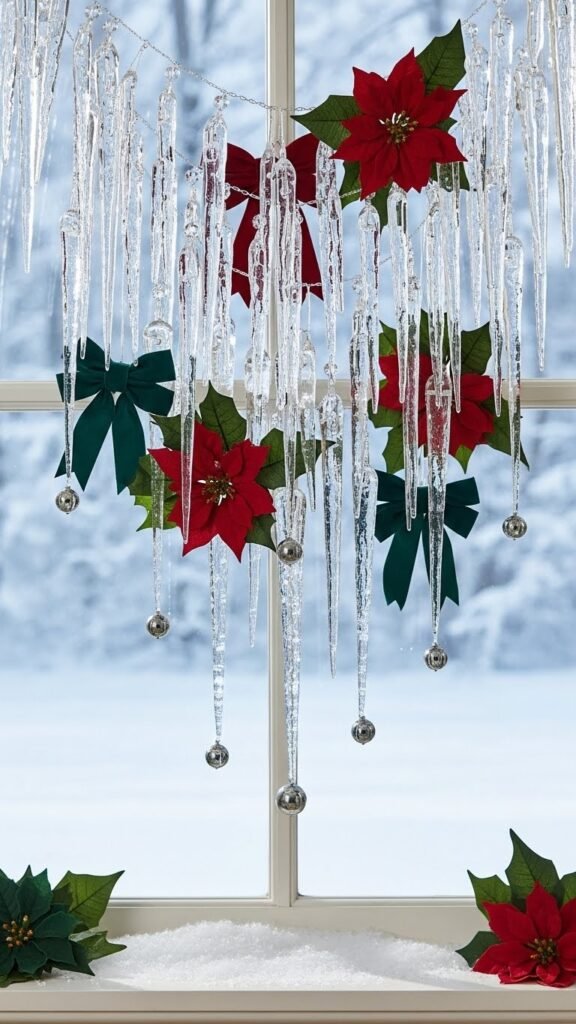 If you loved the vintage glamour of velvet bows and poinsettias, try bringing cool sparkle into the same window with an icicle cluster garland that adds striking vertical dimension.