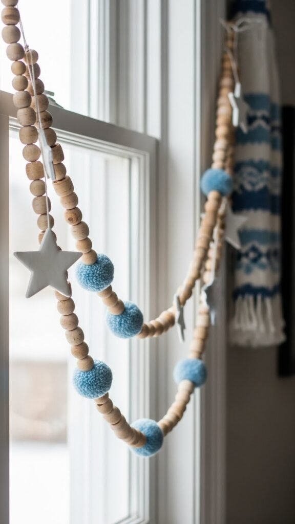Picture a strand of warm birch beads dotted with soft blue wool pom-poms and crisp white stars, and you’ve got the easy elegance of a Nordic-inspired garland that brings calm and texture to your window.