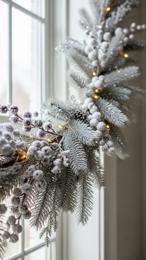 When you drape a garland of frosted berries and silver-painted pine across your window, it catches winter light like a quiet celebration — icy shimmer against evergreen texture.