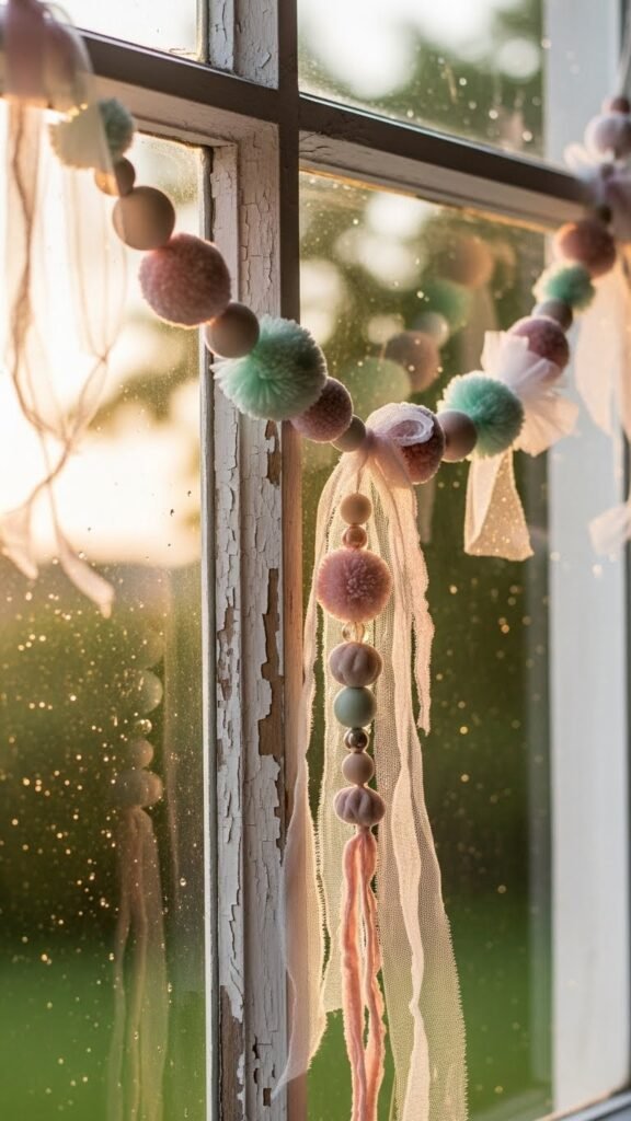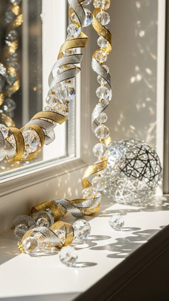 Glinting with warm golds and cool silvers, a Luxe Metallics and Crystal Bead Garland turns your window into a jewelry box of light; you’ll weave metallic ribbons and strands of faceted crystal beads together so they catch both daylight and lamp glow, throwing tiny prisms across the sill.