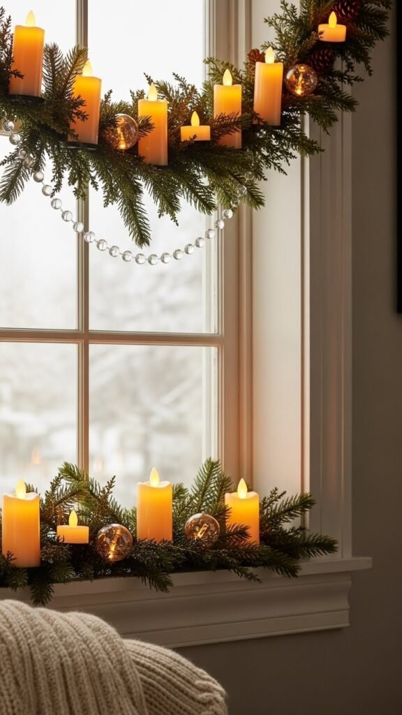 Although you’ll miss the flicker of real flames, a Candlelight Glow Window Garland using LED-safe elements still gives your window a warm, hearthlike presence; soft amber LEDs tucked among faux taper candles, flicker-effect tealights, and sprigs of evergreen mimic that cozy, firelit pulse without the risk.