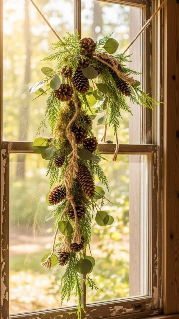 Bring the outdoors in with a Woodland-Inspired Pine and Cone Garland that feels effortlessly rustic and on-trend. You’ll drape mixed-size pinecones placement along a simple jute rope, interspersing soft greenery and mossy accents for texture.