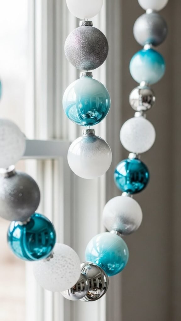 String shimmering glass and matte balls in graduated shades of icy blue, silver, and frosted white to create an Icy Ombre Ball Ornament Garland that feels both modern and cozy.