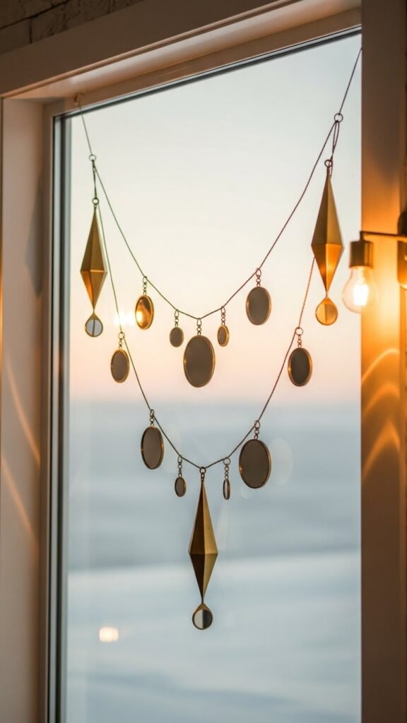 You’ll string brass finials with slim wire, intersperse tiny mirrors for playful mirror reflections, and drape the garland across the pane.