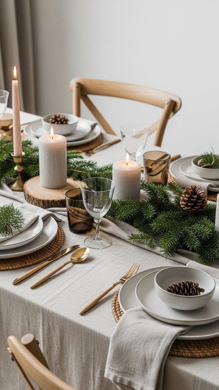 You’ll start with a calm, neutral base—linen or matte stoneware—and build from there, layering texture and surprise so every place feels intentionally cozy. Think quilted runners, reclaimed wood chargers, folded fabric napkins with a pine sprig, and low dough-bowl centerpieces filled with moss, twigs, and bottlebrush trees. These are practical, trend-aware choices that transform a meal into a seasonal moment—keep going to pick up the little tricks that pull it all together.