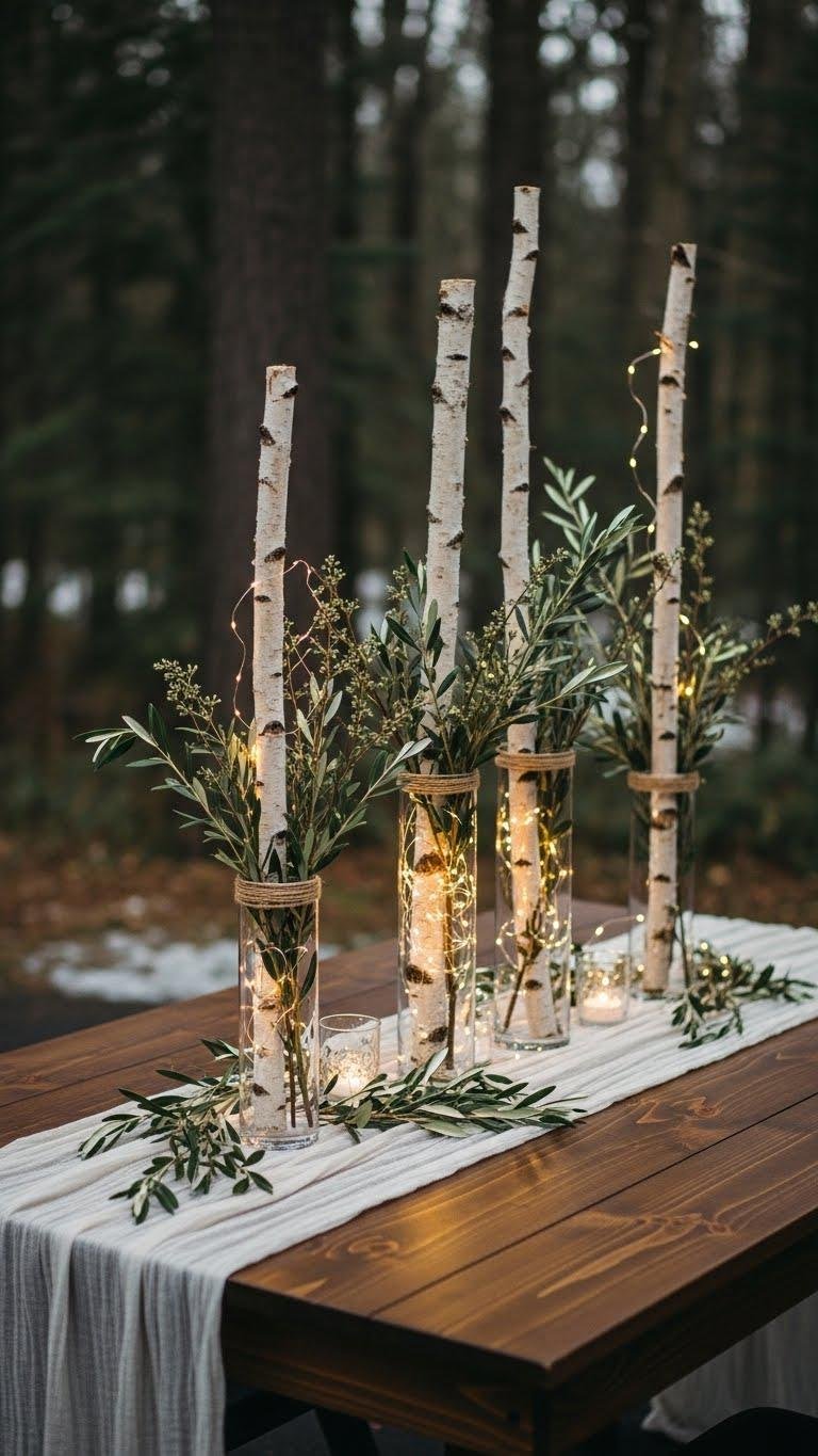 Stand birch branches upright in tall, narrow vases to introduce sculptural height and clean, wintry contrast to your woodland table.