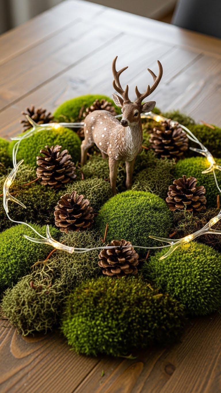 After arranging your mini forest, bring the eye to a single focal point by building a centerpiece around a standing deer figurine—its upright silhouette anchors the scene and introduces a narrative note. Place the deer amid low moss, scatter pine cones, and add subtle antler lighting to highlight woodland silhouettes.