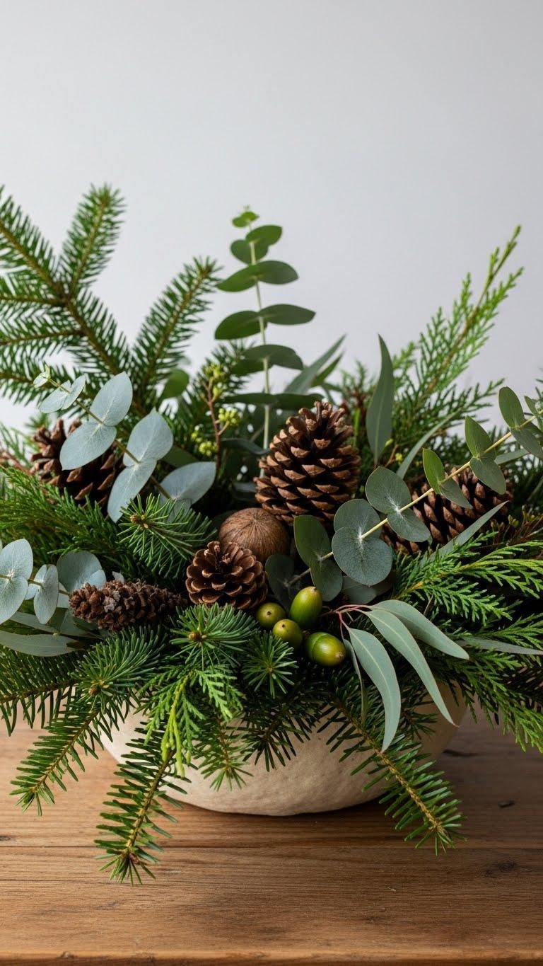 Tuck a mix of evergreens, seeded eucalyptus, and fir sprigs into a shallow dough bowl to create a low, layered arrangement that feels collected rather than contrived.