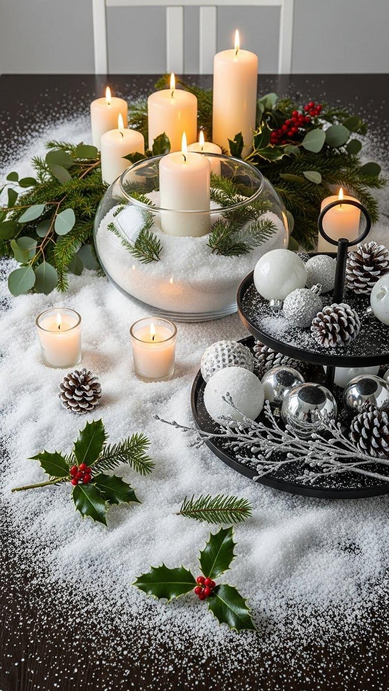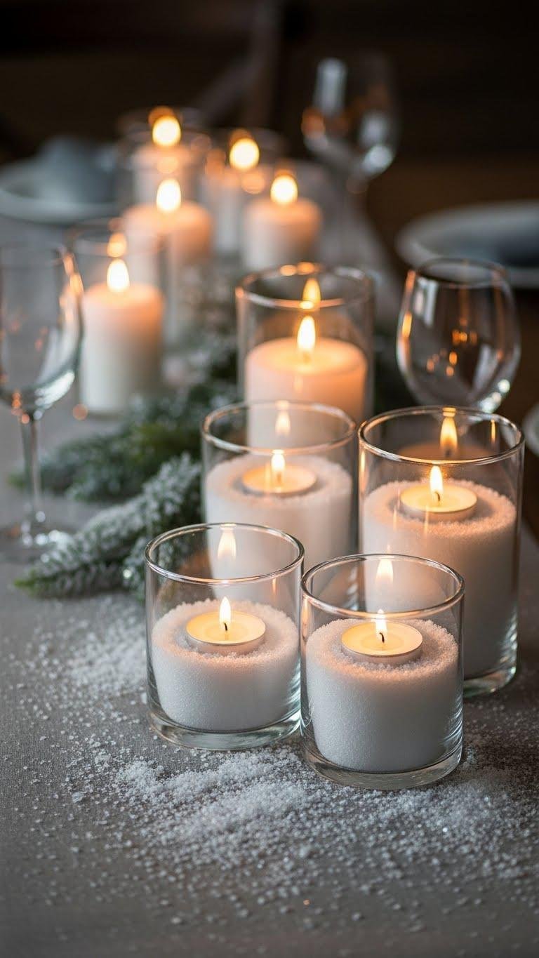 Keep arrangements airy, let glittered snow peek, and let each candle feel like a curated, freeing accent that invites relaxed conversation.
