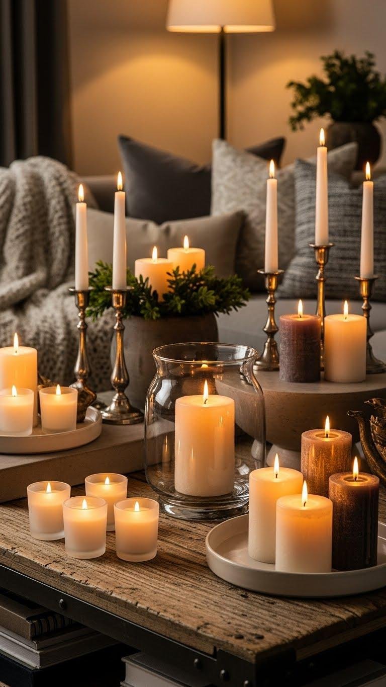Use Chunky Pillar Candles in Hurricane Holders for Cozy Glow