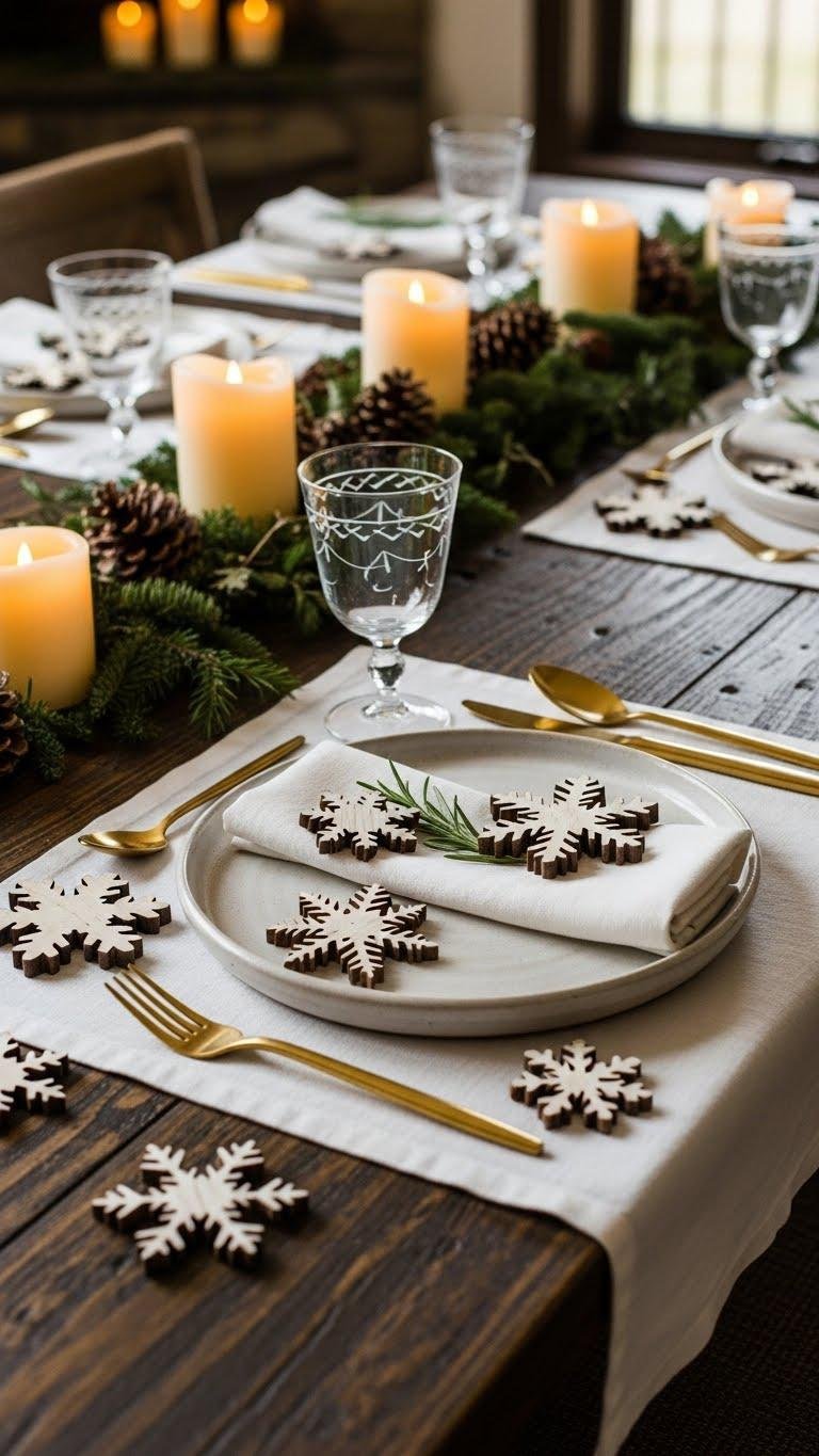 Scatter a handful of small handmade wood snowflakes across each place setting to give your table an inviting, crafted touch that feels both modern and rustic. You’ll use simple handmade templates, snip carefully, and leave tiny character marks — even miniature sawdust — for authenticity. Guests will appreciate the artisanal detail; you’ll create a liberated, cozy atmosphere without fuss or formality.