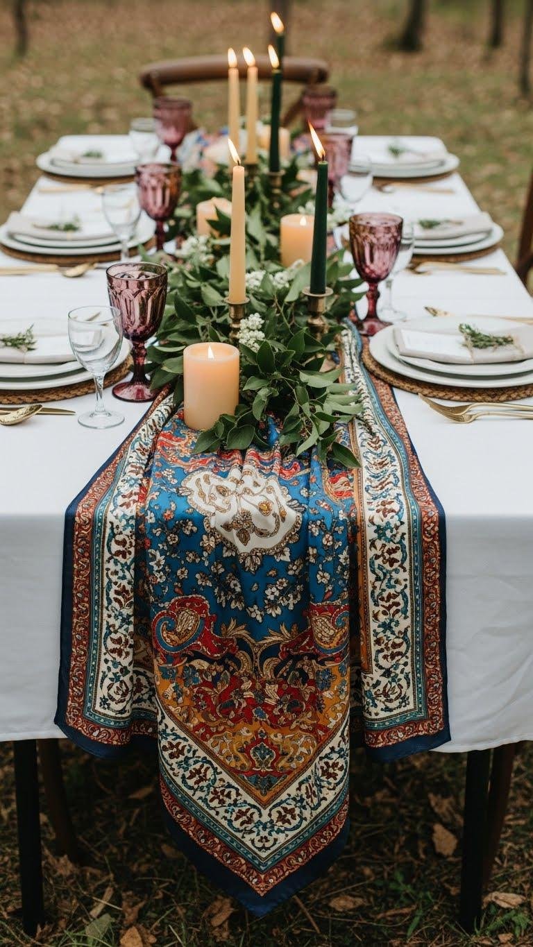 Swap in a long, patterned scarf as an unexpected runner to inject instant personality and soft texture into your woodland table. Choose a silk scarf runner for subtle sheen, or mix fabrics for contrast. You’ll enjoy patterned scarf layering down the center, anchoring candles and greens. Keep edges tidy, let ends drape casually, and celebrate effortless, liberated styling that feels both curated and free.