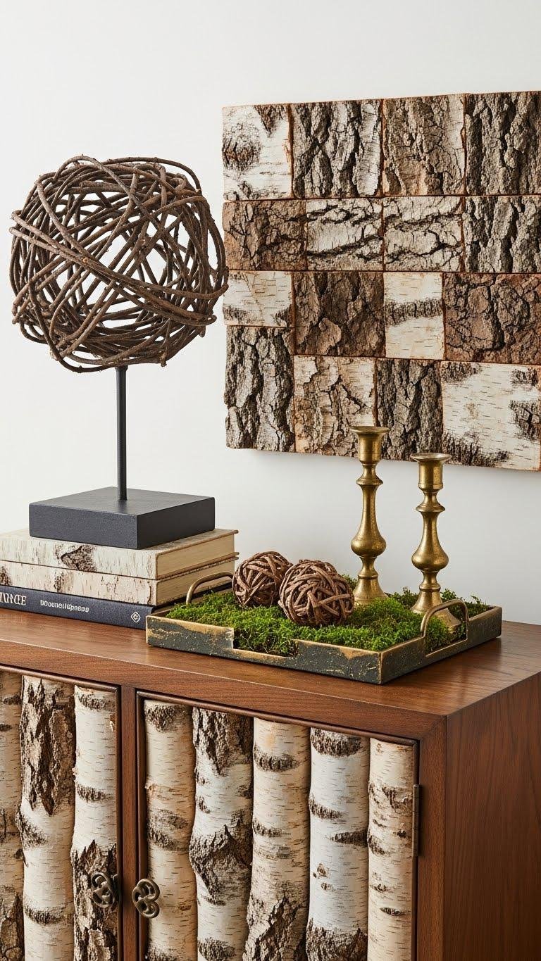 When you layer twigs, birch bark, and other natural textures on accent tables, they instantly anchor the room with woodland warmth and quiet sophistication.