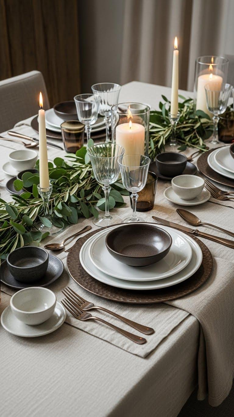 A set of neutral or white plates will let your greenery sing, giving wreaths, sprigs, and eucalyptus room to pop against a clean backdrop. You’ll choose minimalist dinnerware to showcase foliage without competing patterns, creating a calm, liberated table.
