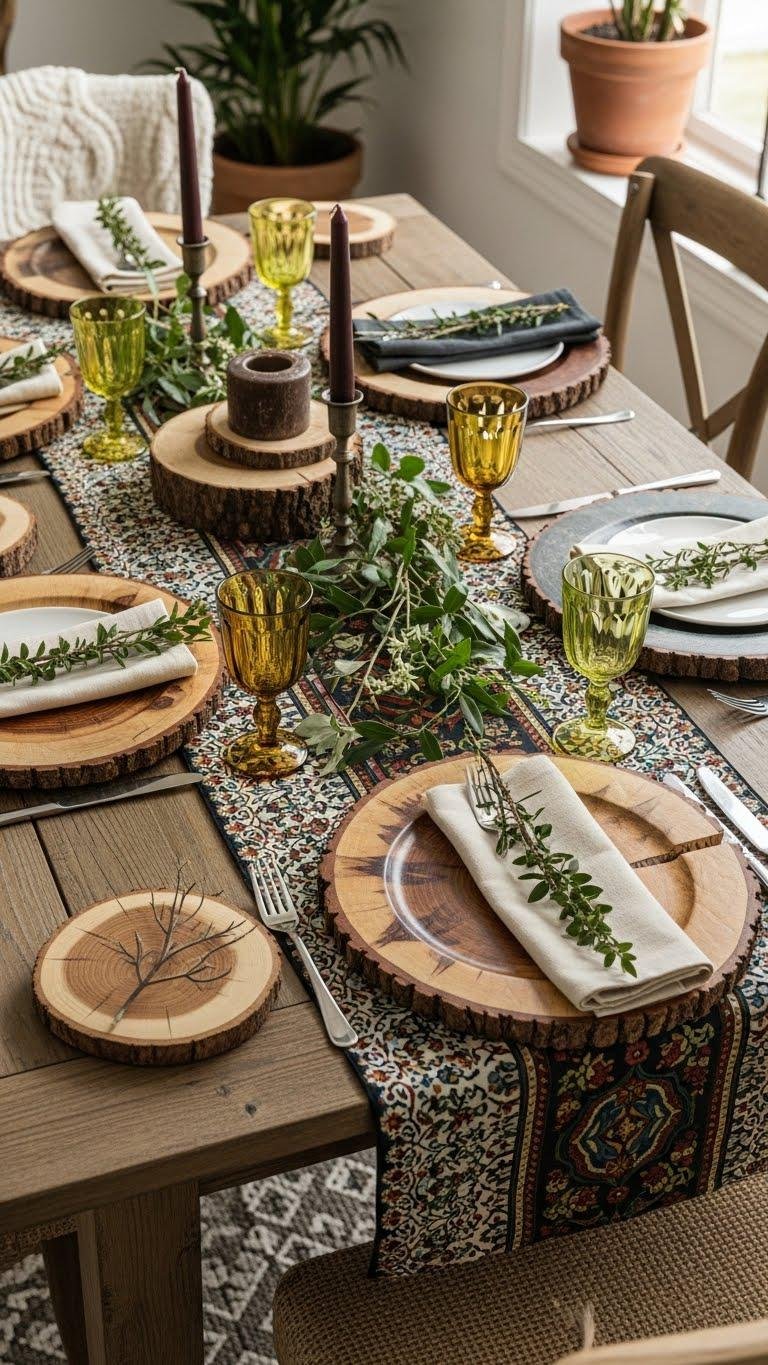 After laying a patterned scarf down the center, grounding each place with a wooden charger will pull the whole woodland look together. Choose hand carved chargers in varied tones so every setting feels unique; reclaimed timber adds history and sustainability.