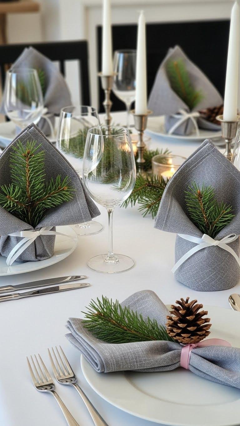 Fold your fabric napkins into simple, elegant shapes and tuck a fresh pine sprig into each for an instant touch of woodland charm.
