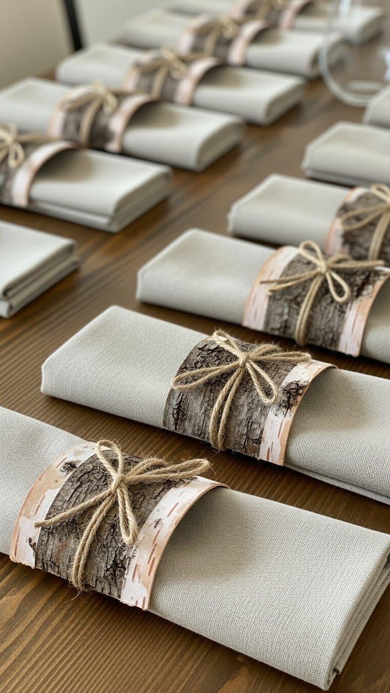 Make your napkin rings feel handcrafted by wrapping twine or thin strips of birch bark around the folded napkin and knotting them securely so they stay put through courses and conversation.