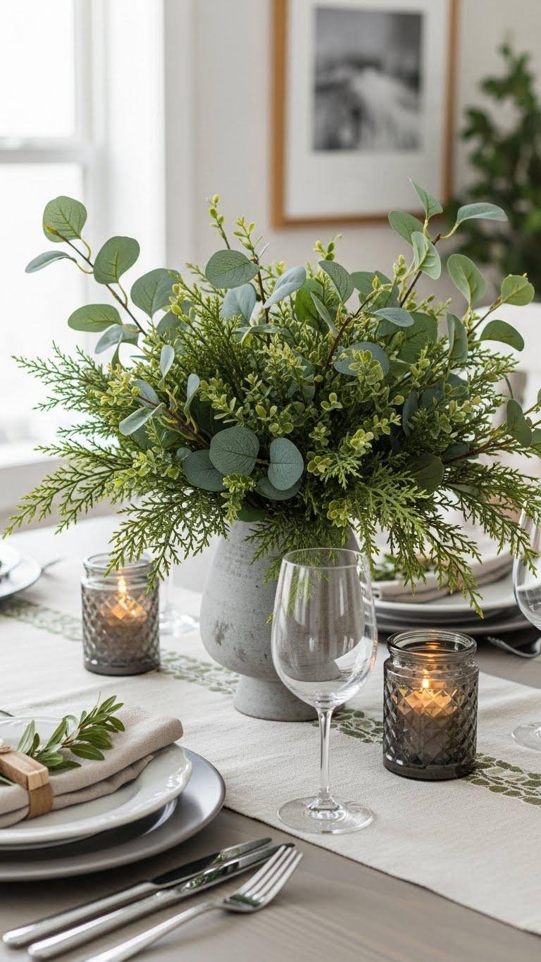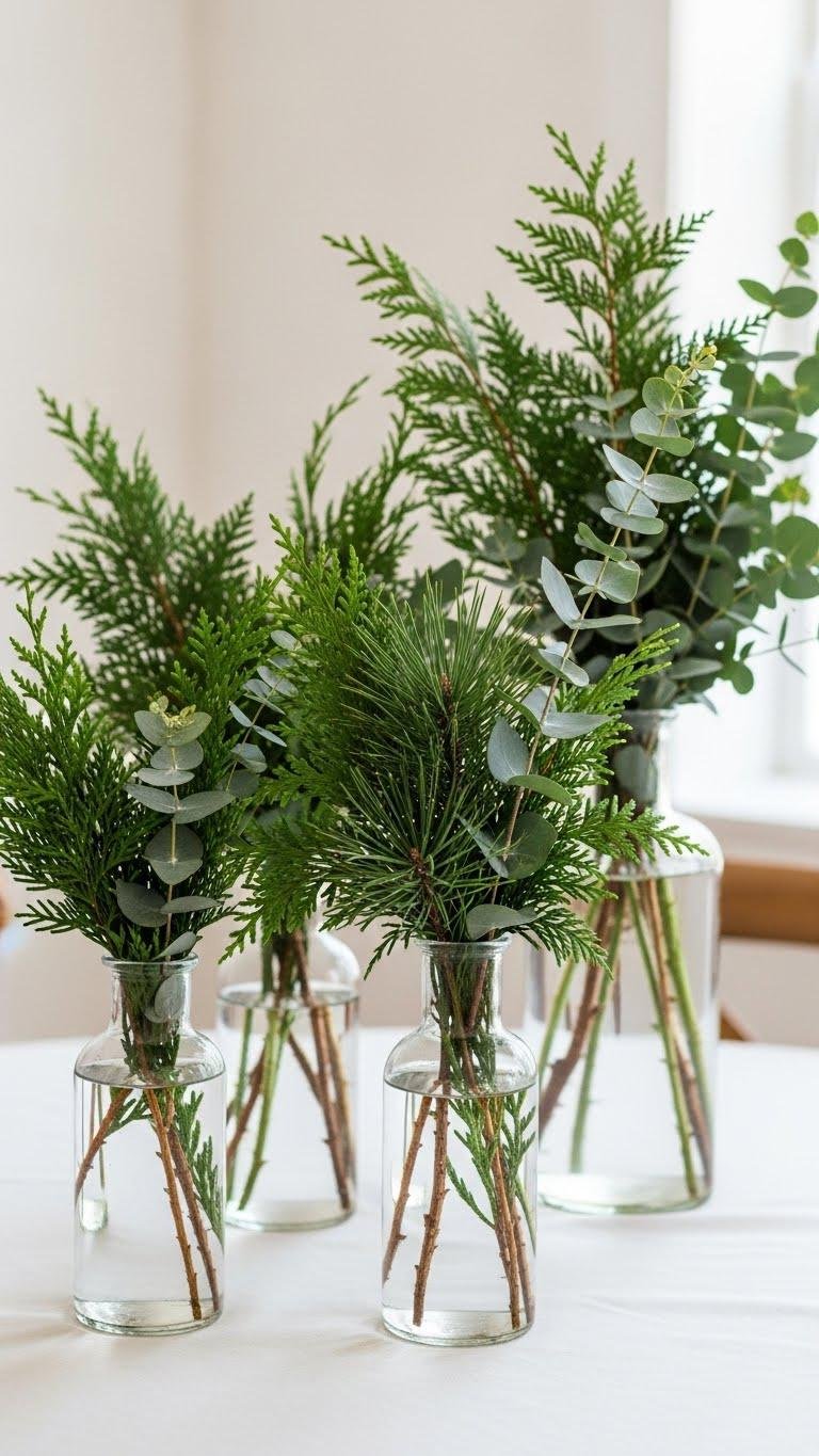 Bringing fresh cedar, pine, or eucalyptus into simple vases instantly lifts your table with evergreen scent and clean silhouettes—place shorter stems toward the center and taller ones at the back for depth, trimming stems at a 45° angle so they drink water efficiently.